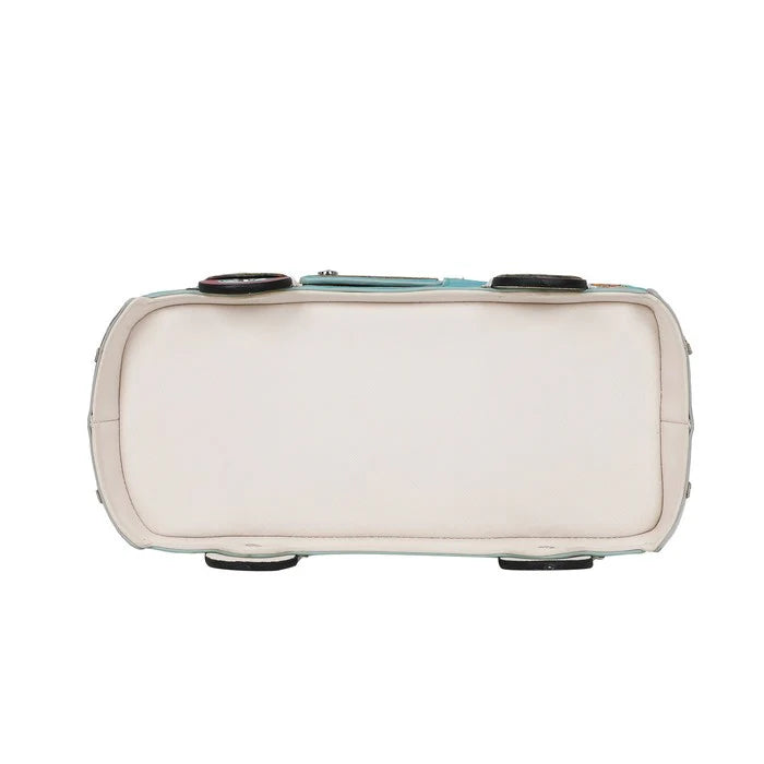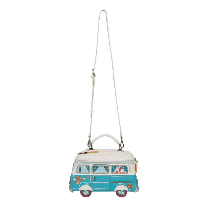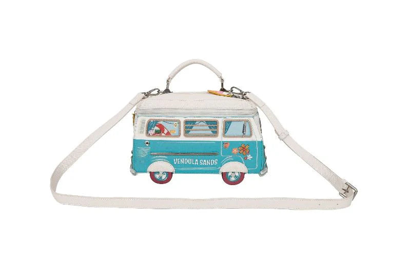 Surf’s up! The Vendula Sands Camper Van - Aqua is a novelty bag ideal for everyday use, with enough room for all your summer essentials. It features a handle and a detachable strap, allowing you to carry it comfortably over the shoulder or crossbody. Crafted from vegan leather, this bag is impressively realistic in the shape of a camper van, with printed and embossed details like headlights, an opening door that reveals a cozy interior, and wheels that keep it stable on any surface. Perfect as a decorative piece when not in use, this bag has us wishing for a life-size version to take you all to the beach.